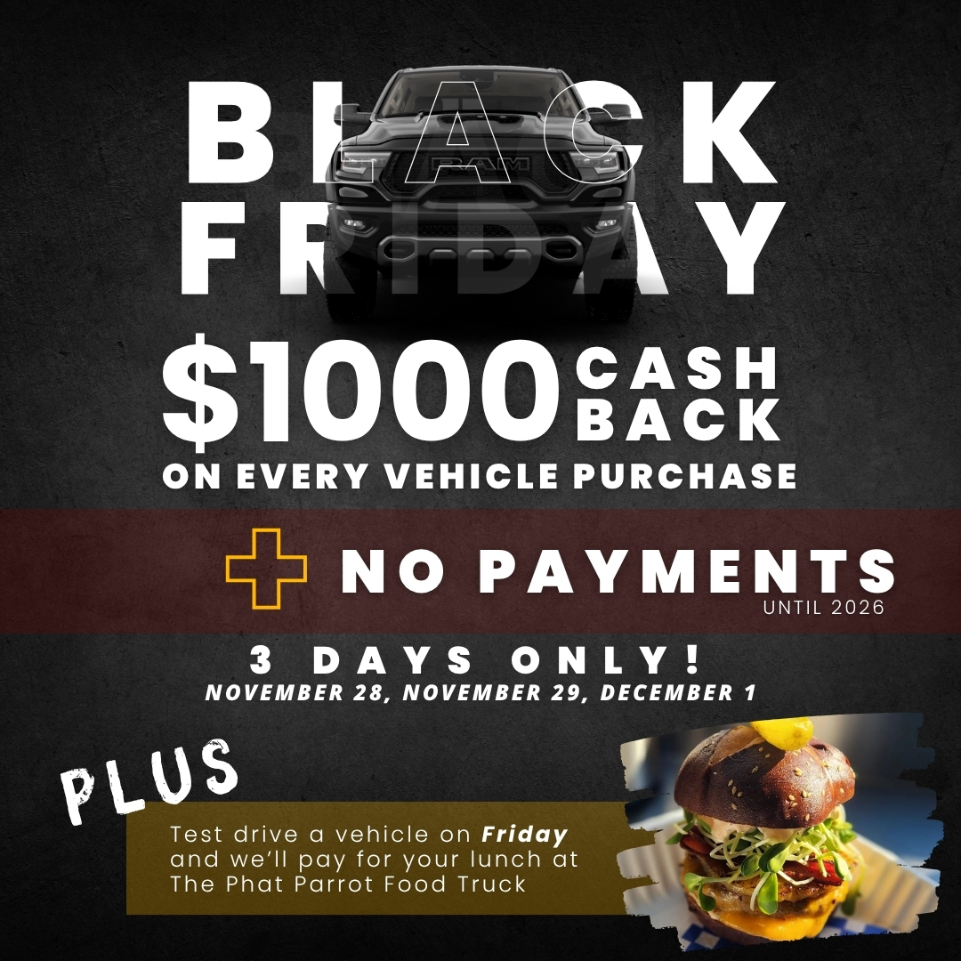 If you’re stopping by on Black Friday, we’re making the experience even better. Take any vehicle for a test drive on Friday, and we’ll buy you lunch at The Phat Parrot Food Truck! Great food, great deals, and great vehicles… what more could you ask for?