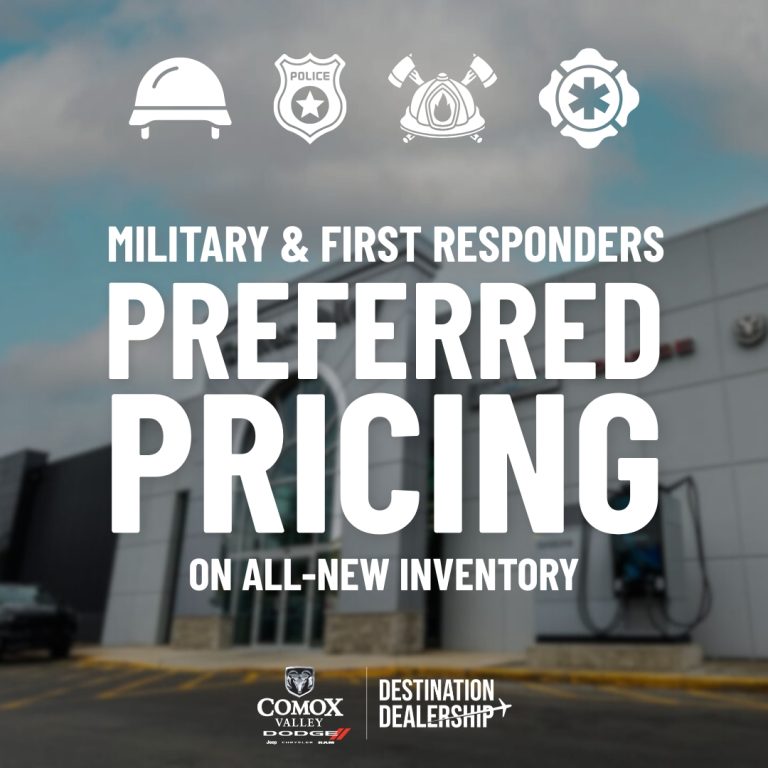 At Comox Valley Dodge, we’re proud to stand behind the brave men and women who serve our country and our communities. To show our appreciation for our military members—both current and past—and our dedicated first responders, we’re offering Preferred Pricing on all new inventory. That means you pay what we pay. It’s our way of saying thank you for your courage, commitment, and service. Whether you’re on the front lines at home or abroad, we’re honored to give back to those who give so much.