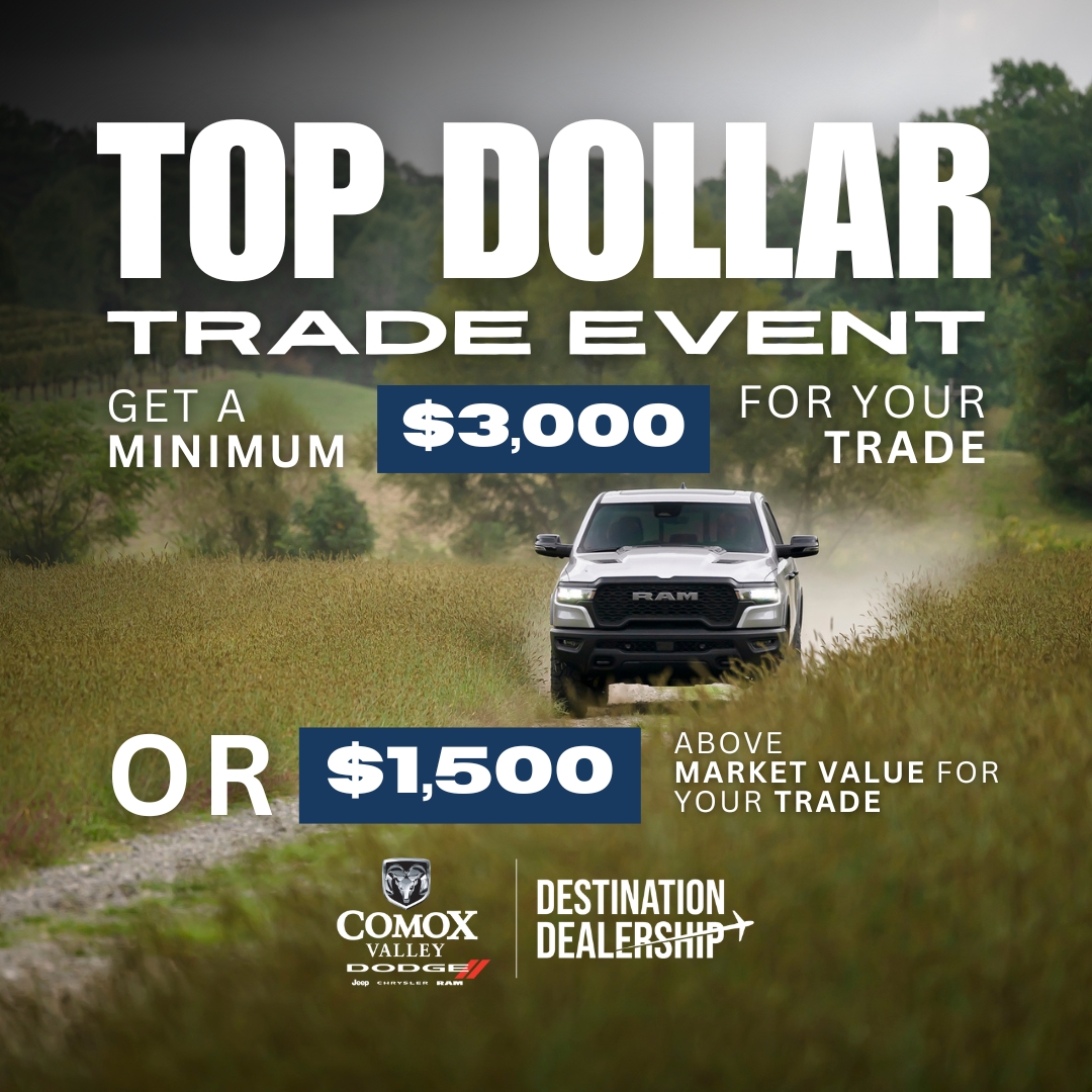 Is your old vehicle taking up space in the driveway? Whether it runs perfectly, barely starts—we’ll take it! During our Top Dollar Trade Event, Comox Valley Dodge is paying $3,000 minimum* for any trade-in, no matter the condition.